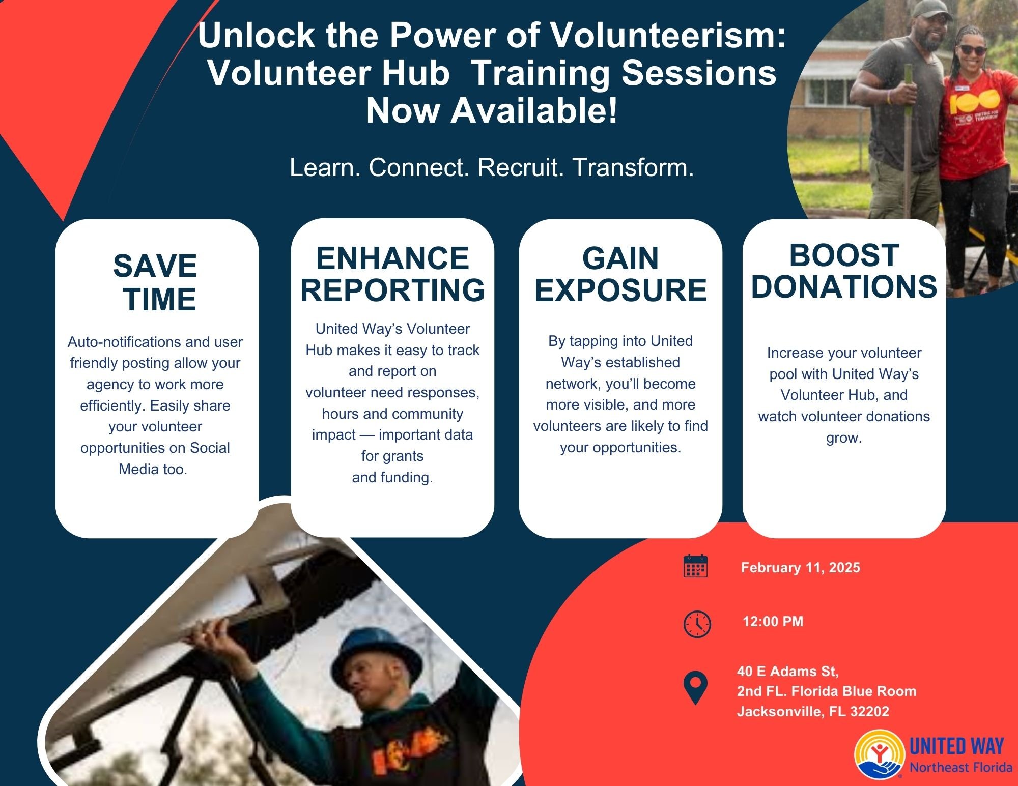 Are you a nonprofit organization in Jacksonville, Florida, looking to enhance your volunteer recruitment and management strategies? We will be hosting United Way of Northeast Florida Volunteer Hub training. Our Volunteer Hub Training sessions are designed to help nonprofit agencies: