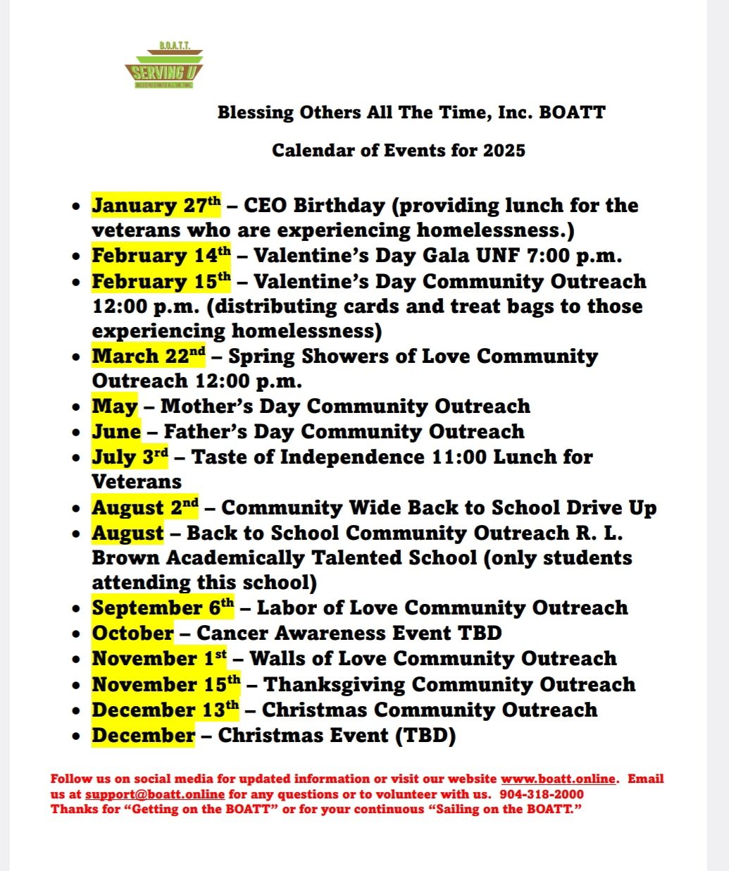 These are our events for 2025.  Please email us at support@boatt.online for more information or to volunteer.  We will list them individuals if we are still in need of volunteers when the dates are closer.
