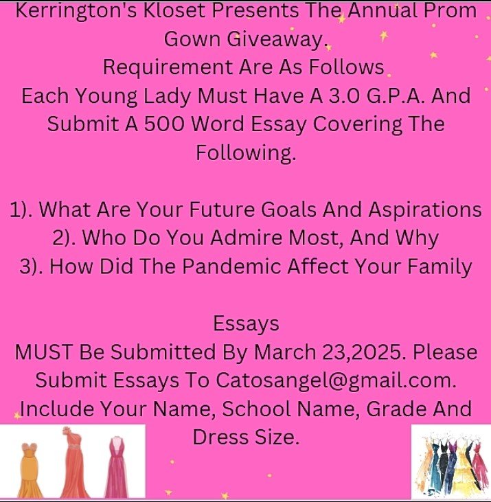 Know a young lady that is longing for a prom dress, but can't afford one? This is your opportunity! Any student with a 3.0 GPA or more can submit an essay to participate in the competition. See below for details and spread the word!