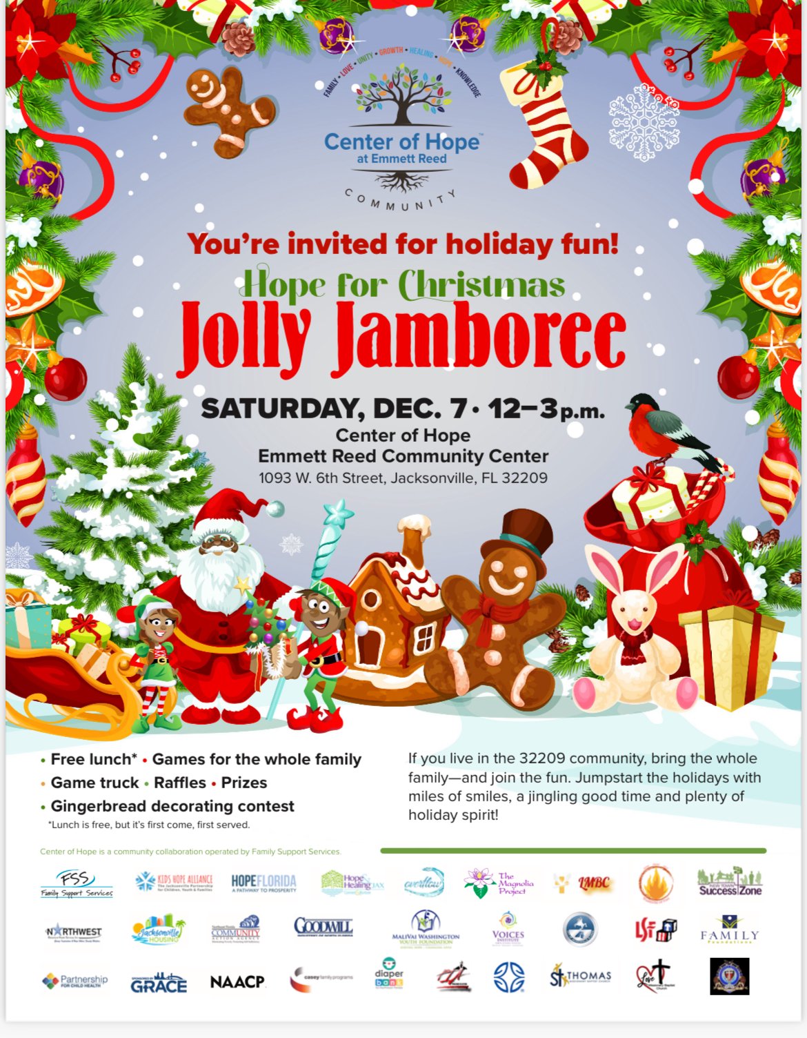 We are requesting for volunteers to assist with a 32209 community event with Center of Hope Jolly Jamboree. Volunteers will be assisting with family engagement of games. We are also looking for volunteers to assist with breaking down tables and chairs toward the end of the event.