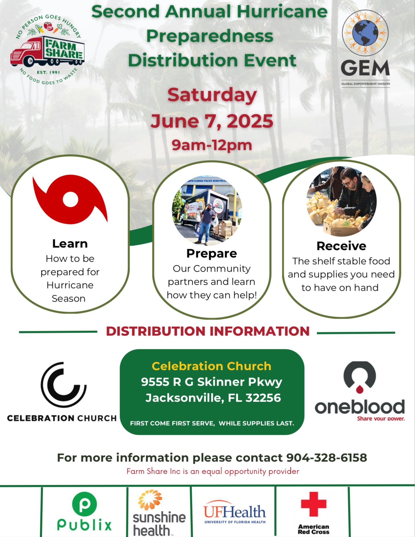 On June 7th 2025, Farm Share is providing the community of Duval county with hurricane preparedness commodities for 1000+ families.